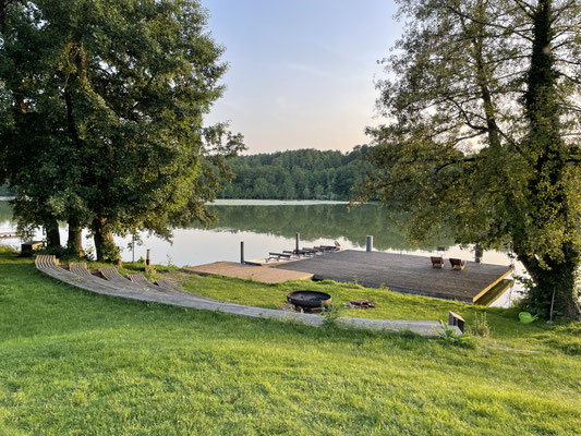 danach wenn das Wetter es zulässt, Verweilen an der Feuerschalle mit dem Blick zum Klostersee und der Abend-Sonne